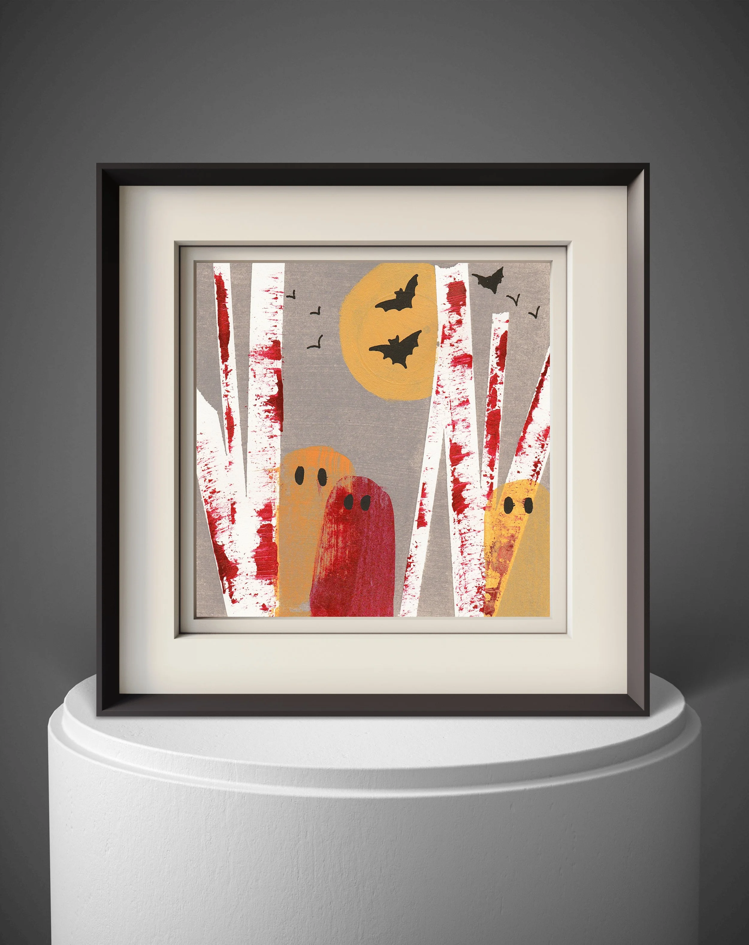 Shy ghosts play peek-a-boo among haunted birch trees in this 8×8 acrylic art print.