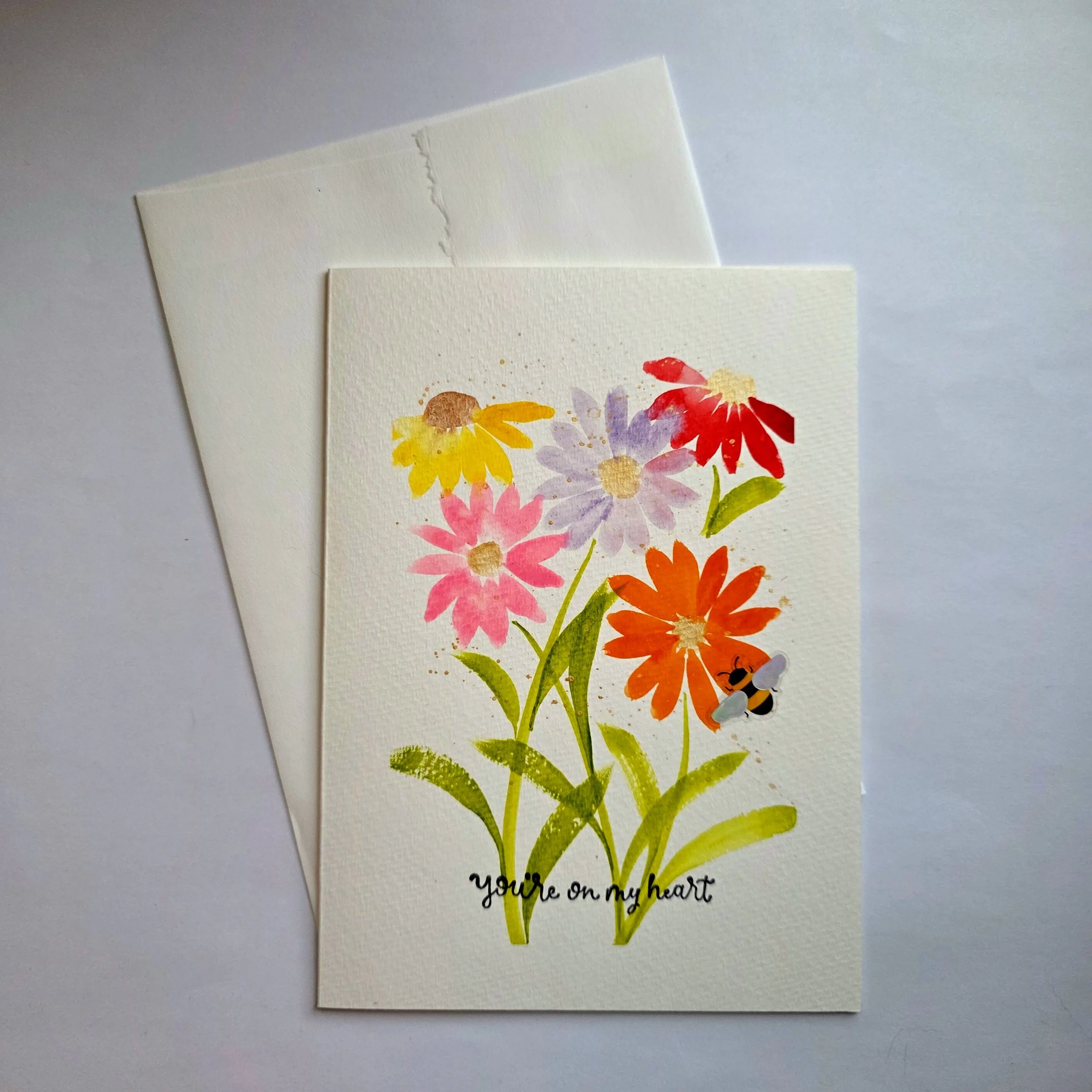 Hand-painted watercolor greeting card featuring rainboe daisies and an iridescent insect sticker.