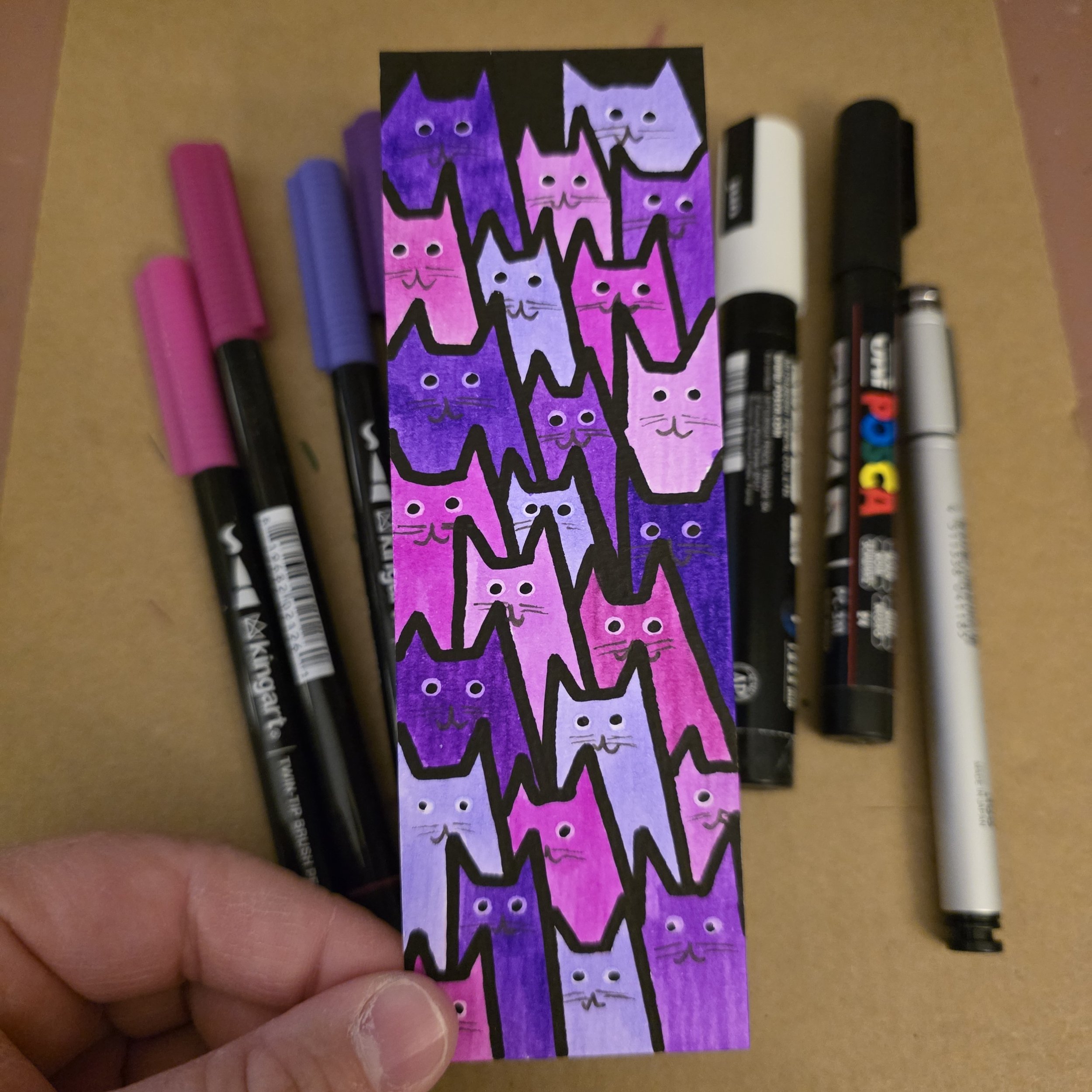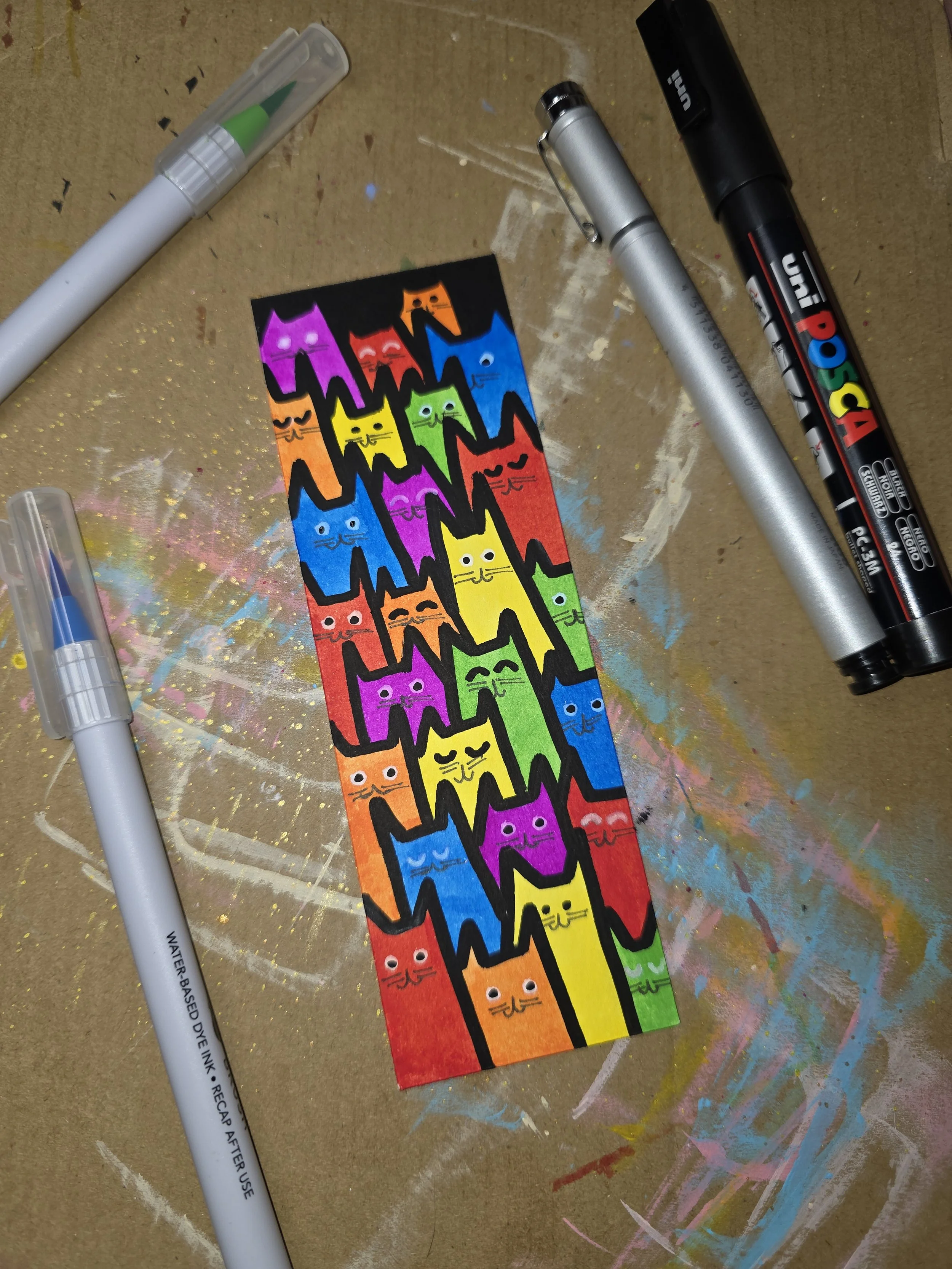 Hand-painted bookmark featuring playful, colorful cats. Customize this bookmark to feature your favorite colors!