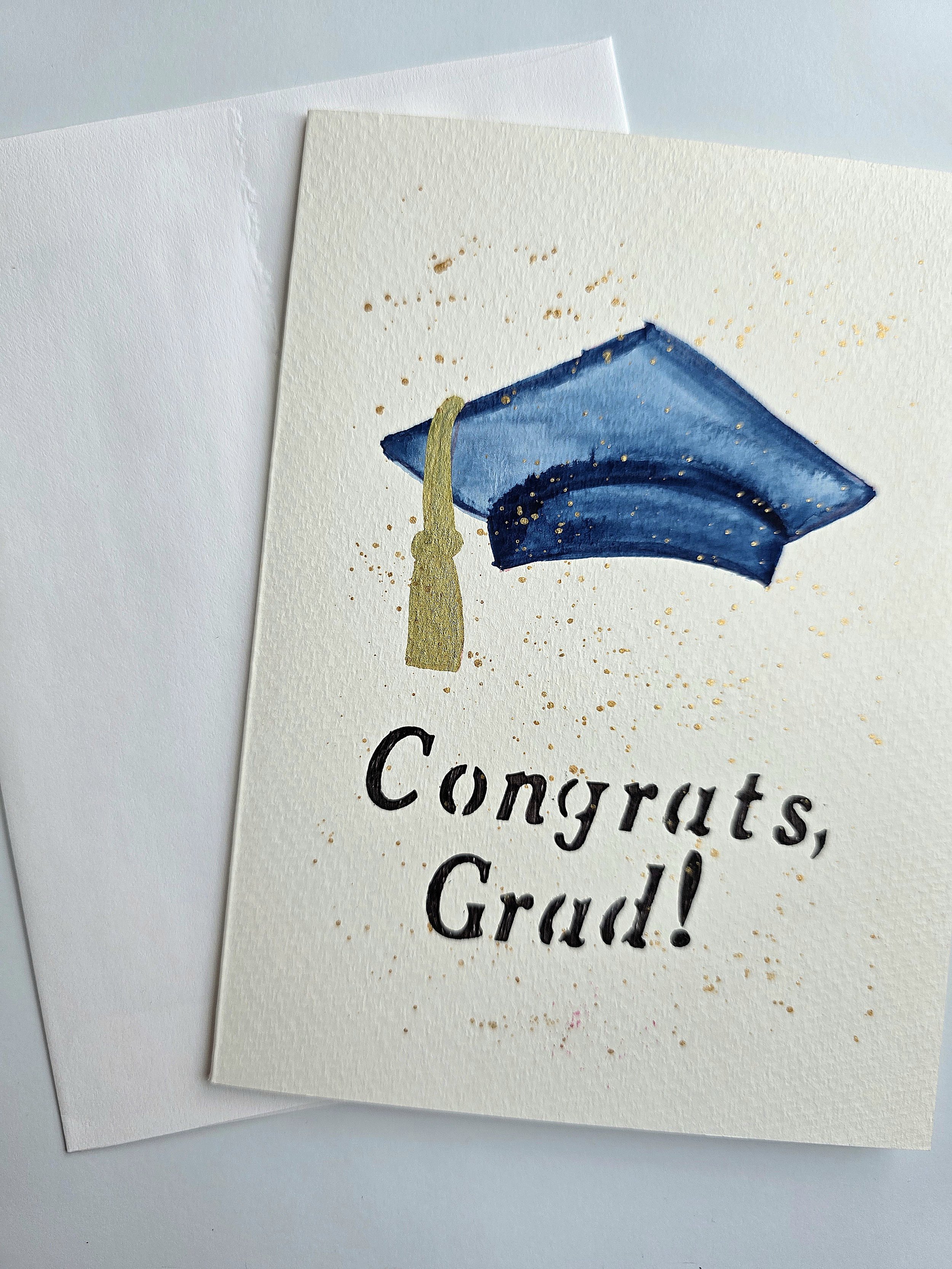 Hand-painted watercolor greeting card featuring a graduation cap and delicate gold splatter accents.